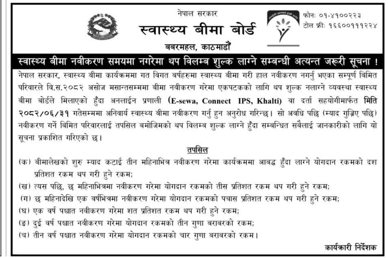 स्वास्थ्य बीमा नवीकरण समयमा नगरेमा थप शुल्क लाग्ने सम्बन्धी अत्यन्त जरुरि सूचना !